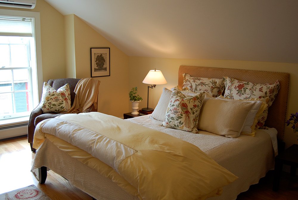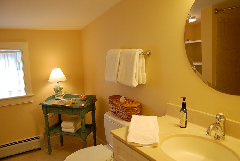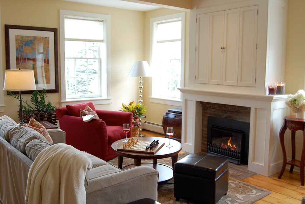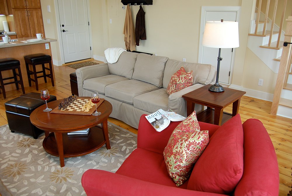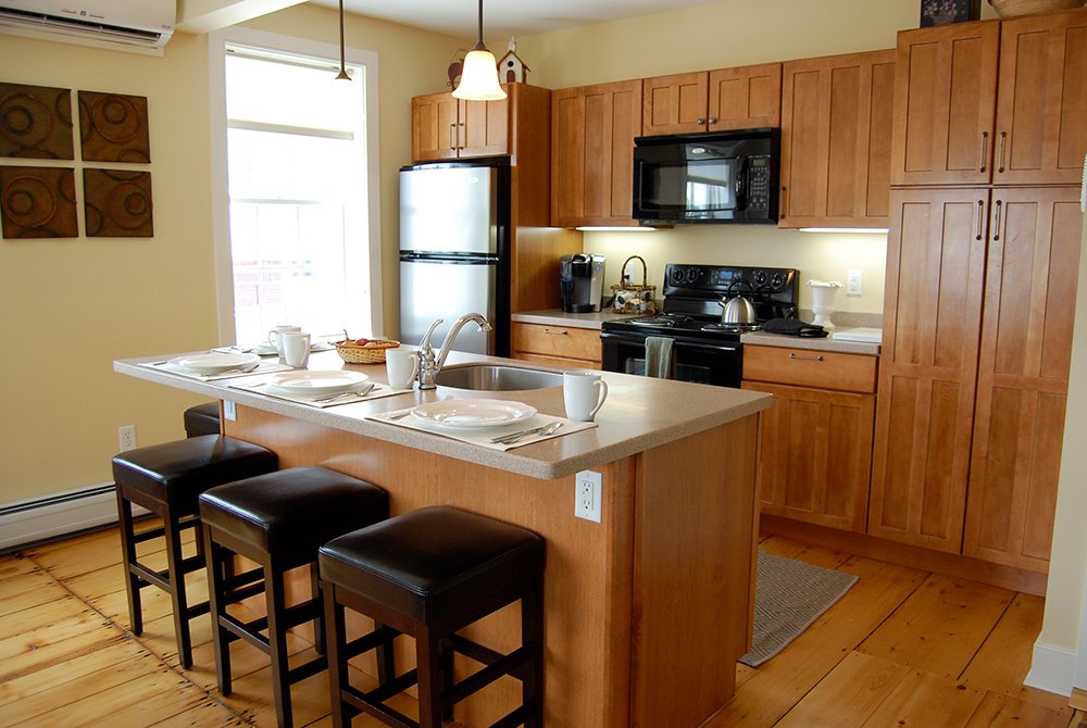 Enter into an airy, open living space with windows on two sides. Relish in views of Main Street and the Community Church. Enjoy the seating area and open the cabinet doors to reveal a large HDTV hidden above the gas fireplace. Dine-in with a full kitchen equipped including a refrigerator, microwave, 4 burner stove, and an oven. Two quiet bedrooms with queen-sized beds and cable tv share a bath with a combination tub and shower on the second floor.
